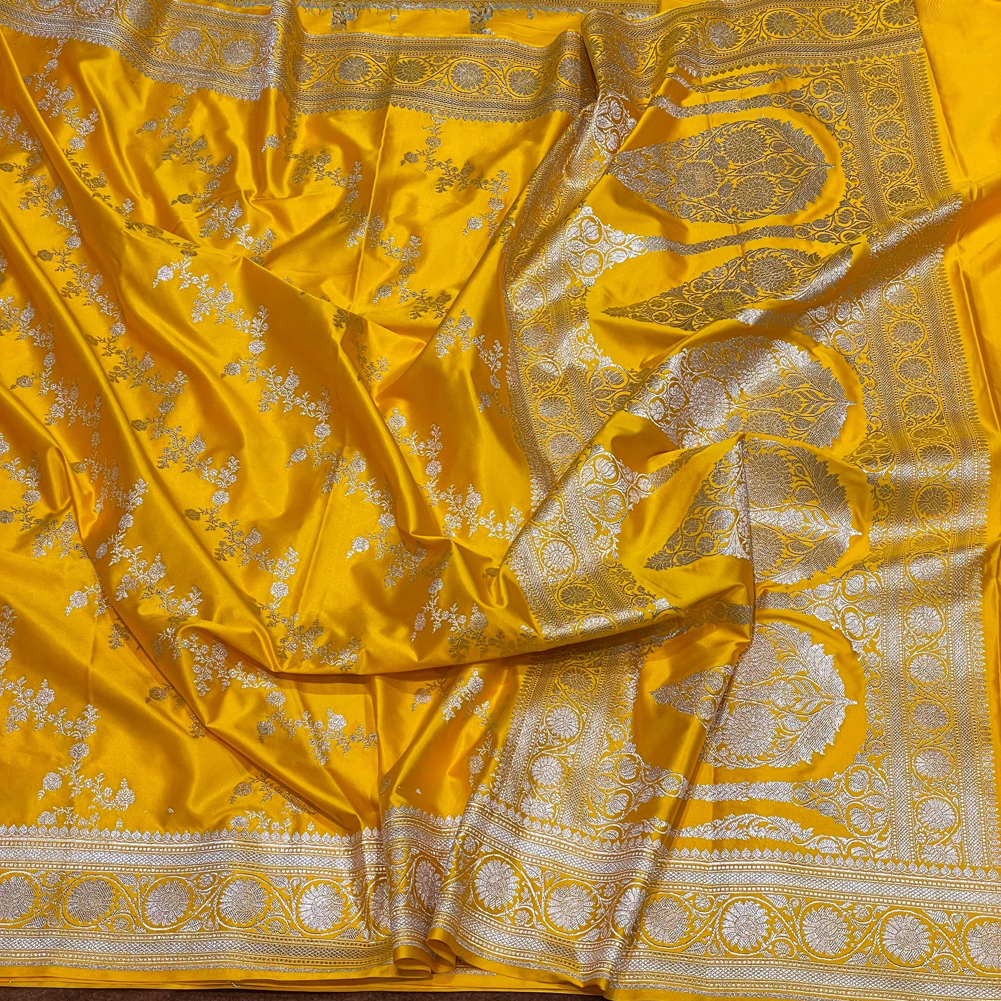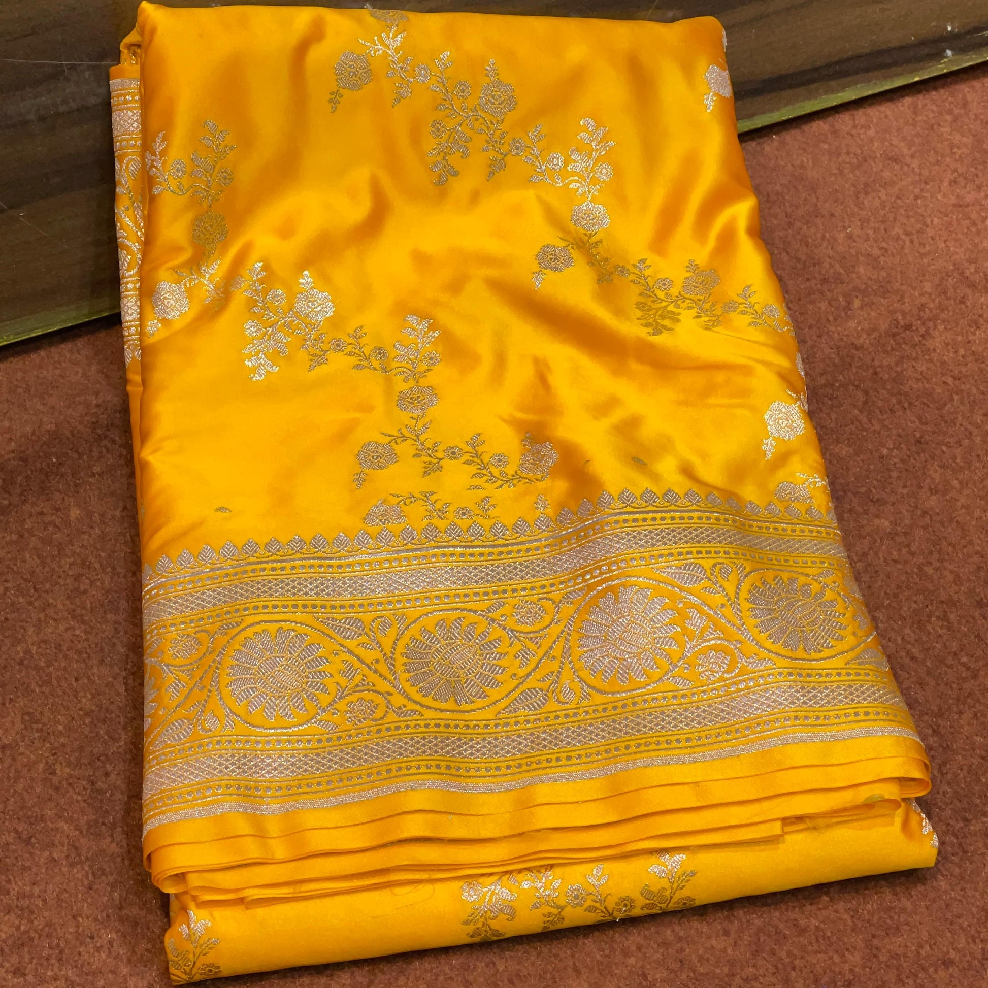 Brighten your celebrations with the Yellow Gold Haldi Mashru Silk Saree. Featuring a radiant yellow gold hue, this saree is crafted from luxurious Mashru silk that offers a smooth, comfortable drape. Its vibrant color and elegant texture make it an ideal choice for festive occasions and traditional ceremonies, helping you shine with grace and confidence.